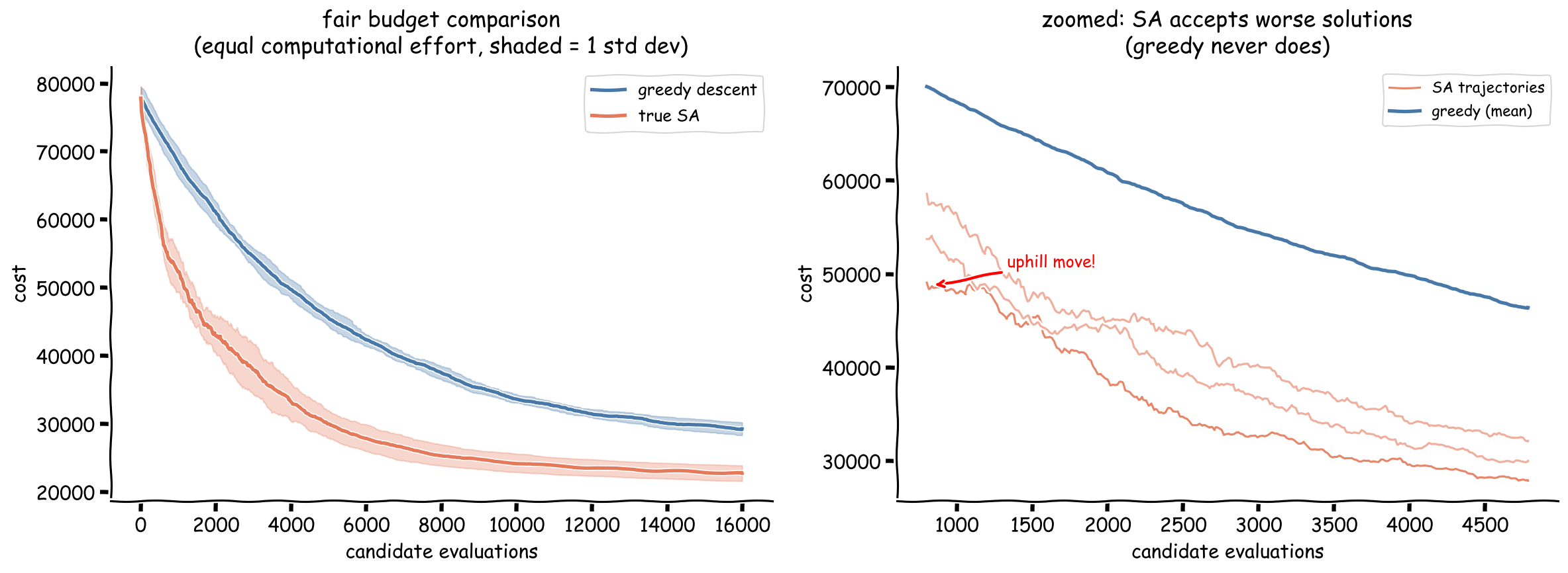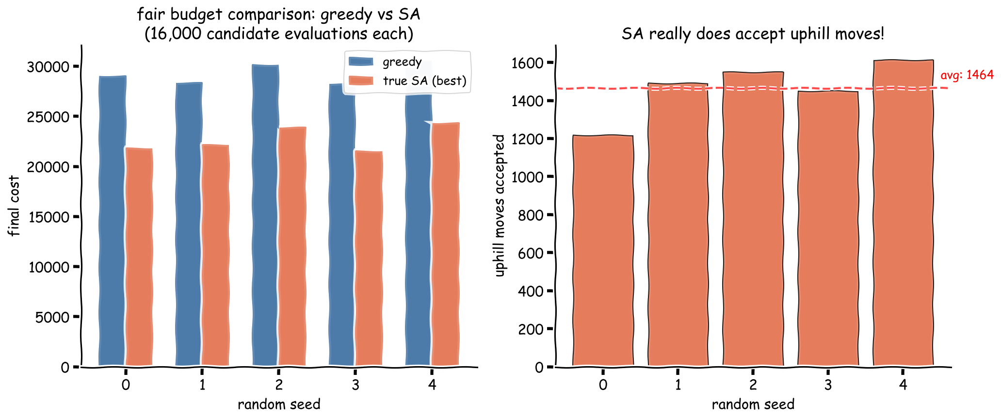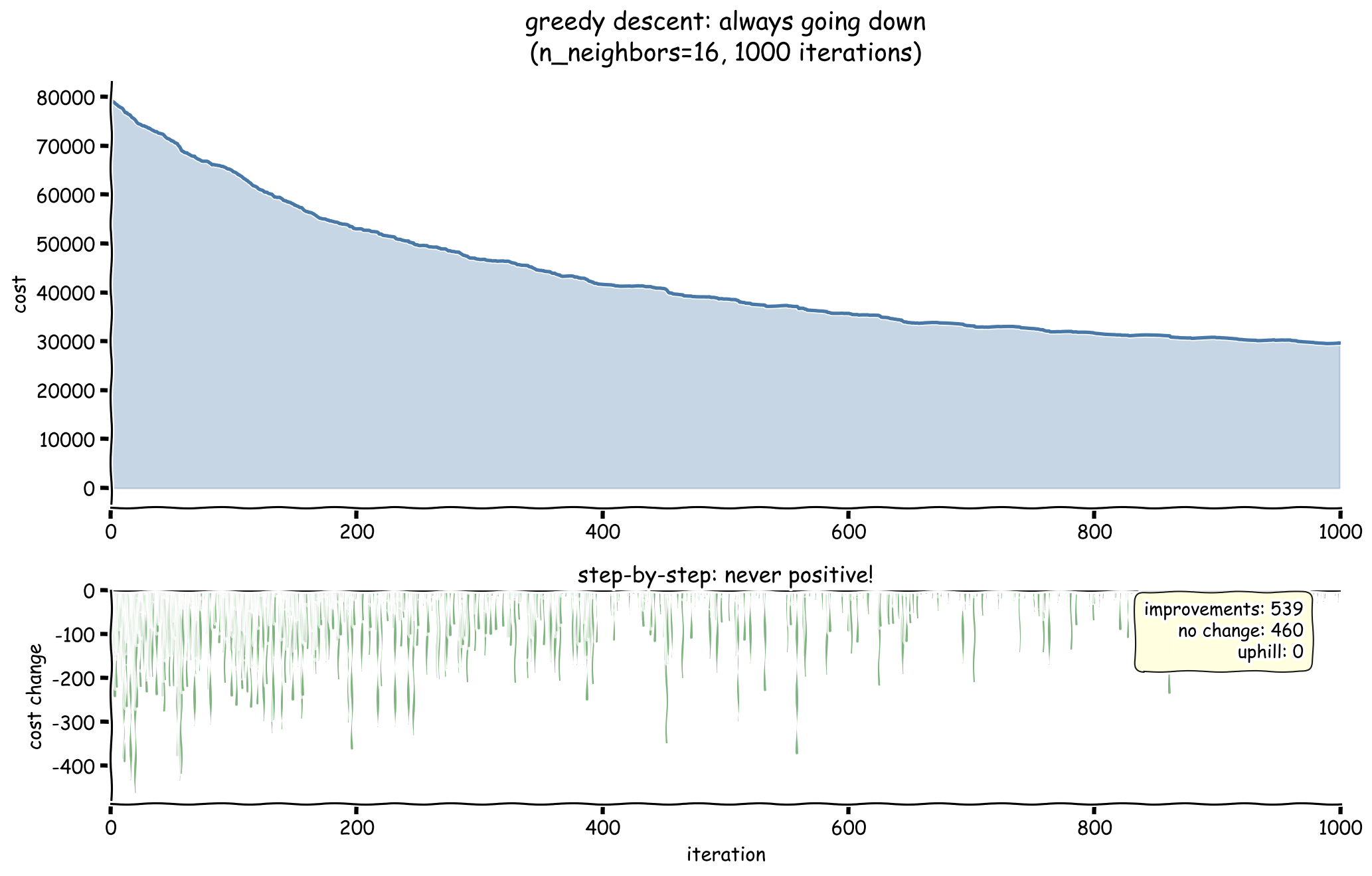 The statistics tell the story: zero uphill moves were ever accepted. This is the signature of greedy descent -- once the algorithm stops finding improvements, it is stuck with no mechanism to escape local optima.